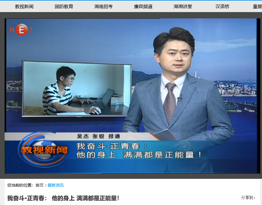 6月10日湖南教育电视台首页最新资讯,以《我奋斗·正青春:用行动丈量生命的厚度》为题对我校计算机与通信工程学院15级研究生邹勇松进行了报道。
