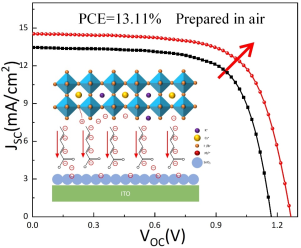 光伏发电属于新质生产力的范畴,大力发展光伏发电产业有助于实现我国“双碳”战略目标。目前,传统硅基太阳能电池存在制造成本高、污染大等问题。新型钙钛矿太阳能电池具有理论极限效率高、制备方法简单等特点,应用潜力巨大。全无机钙钛矿由于其理想的带隙和良好的热稳定性而在众多钙钛矿材料中受到极大关注。然而,由于全无机钙钛矿材料对水氧敏感,导致全无机钙钛矿太阳能电池在空气中的稳定性较差。因此,以往的全无机钙钛矿太阳能电池大多是在惰性气氛环境下制备,这对制备设备的要求较高,还增加了资源消耗。此外,器件的埋底界面存在缺陷密度高、材料热膨胀系数不匹配的问题,影响了器件效率和寿命。