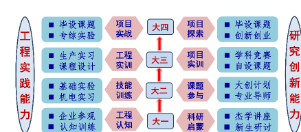 “双递进”培养体系,即覆盖大一到大四、从易到难、循序渐进的阶段递进培养体系,通过大一的企业参观与工程认知训练、大二的基础实验与校内外工程实习、大三的生产实习与课程设计、大四的专业综合实验与毕设课题,递进式培养学生的工程素养与实践能力;通过大一的杰出学者讲座与新生研讨课作为研究型学习起点、大二的大创计划与大三的学科竞赛作为研究型学习支撑、大四的毕设与创新创业课题研究作为学术探索抓手,递进式培养学生科研素养与创新能力。